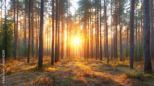 Obraz premium Sunlight filters through tall trees in a serene forest landscape creating a tranquil atmosphere at dawn