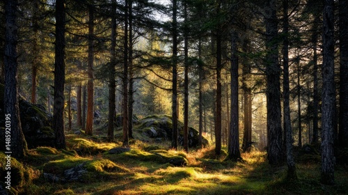 Obraz premium Sunlight Filters Through Tall Trees in a Serene Forest Setting Surrounded by Green Moss and Rocky Terrain