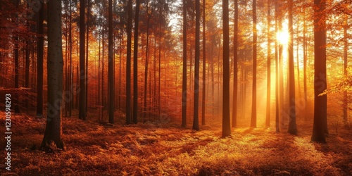 Obraz premium Sunlight filters through tall trees in an autumn forest, casting a warm glow...