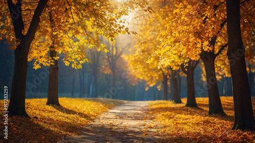 © janzwolinski, Fototapeta premium Sunlight filters through the autumn trees in a foggy forest, casting shadows on the fallen leaves below.