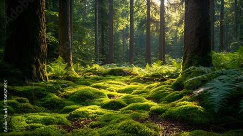 Fototapeta premium Sunlight filters through the canopy of a dense forest, illuminating the mossy...