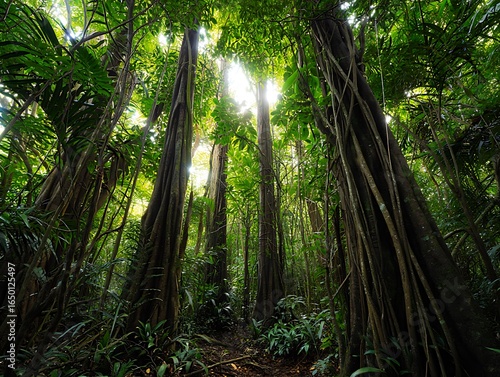 Fototapeta premium Sunlight Filters Through the Lush Green Canopy of a Tropical Rainforest