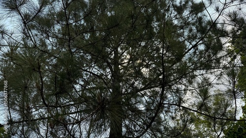 Obraz premium Sunlight filters through the needles and branches of a towering pine tree...