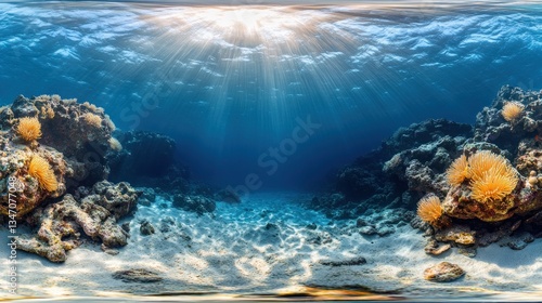 Fototapeta premium Sunlight filters through the ocean, illuminating coral reefs and sandy bottom