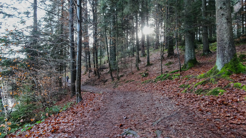 Obraz premium Sunlight filters through the trees along a forest path beside a tranquil...