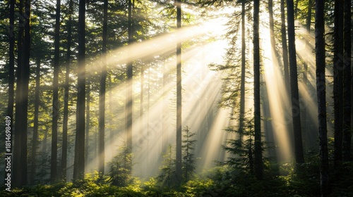 Fototapeta premium Sunlight filters through the trees, casting a warm glow on the forest floor.