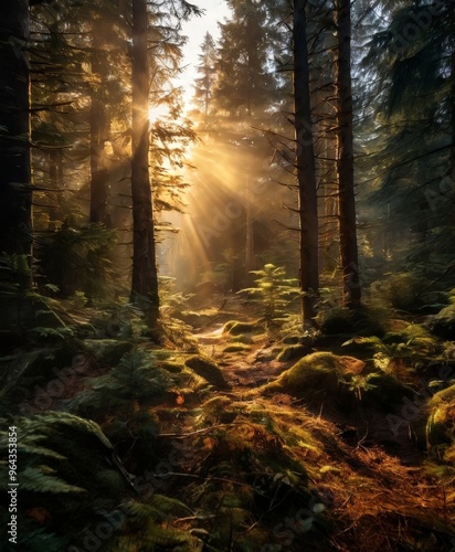 © Nipon, Fototapeta premium Sunlight filters through the trees, casting a warm glow on the forest floor and creating a serene atmosphere.