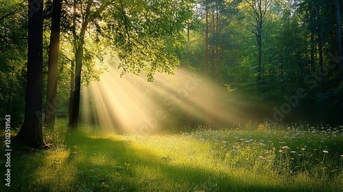 © Anisah, Naklejka premium Sunlight filters through the trees illuminating a lush meadow in the forest creating a beautiful landscape scene