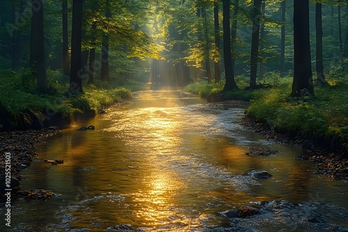 Naklejka premium Sunlight filters through the trees, illuminating a tranquil river winding...