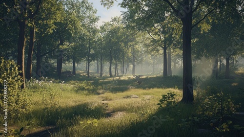 Fototapeta premium Sunlight filters through the trees in a peaceful forest scene with a grassy path