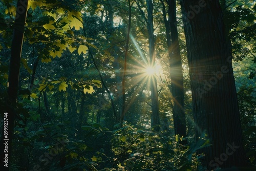 © Ольга Лукьяненко, Obraz premium Sunlight filters through the trees in a serene forest, casting a warm glow over the lush greenery