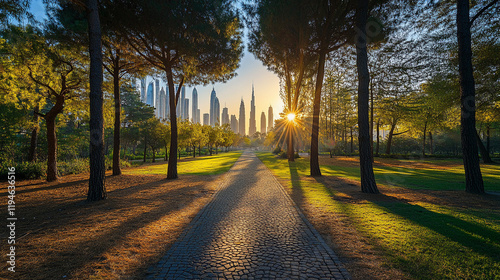 © Sajib, Naklejka premium Sunlight filters through trees along a path with a city skyline in the background at sunset