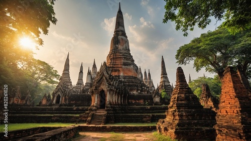 Fototapeta premium Sunlight filters through trees, casting soft glow on ancient temple complex. Structures, adorned with intricate designs, towering spires, stand majestically amidst lush greenery.