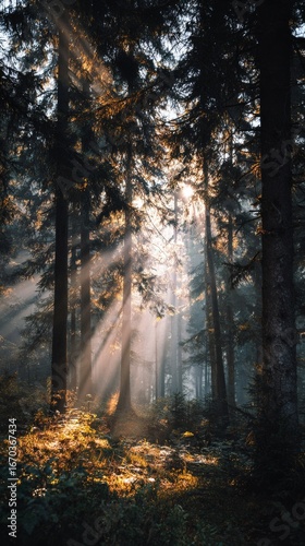 Fototapeta premium Sunlight filters through trees, creating a magical, light-filled forest scene.