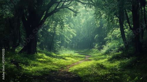 © Olexandr Tytarchuk, Obraz premium Sunlight filters through trees, illuminating a serene forest path in a lush green landscape
