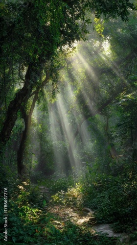 © InfiniteStudio, Obraz premium Sunlight filters through trees in a lush forest creating a serene atmosphere during early morning hours