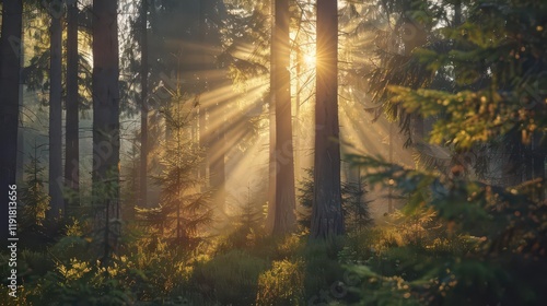 Fototapeta premium Sunlight filters through trees in a serene forest, creating a peaceful...