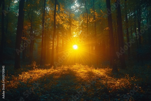 © QuantumMuse, Obraz premium Sunlight filters through trees in a serene forest during golden hour
