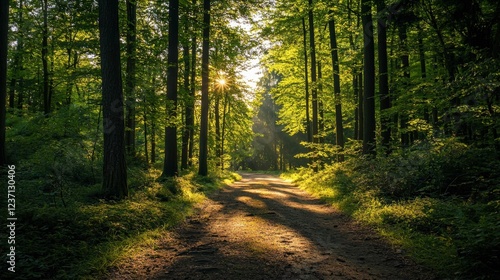 © Kitta Studio, Obraz premium Sunlight Filters Through Trees in a Serene Forest Pathway
