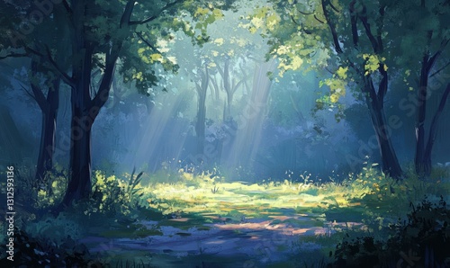 © Vitalii, Obraz premium Sunlight filters through trees in a serene forest scene.