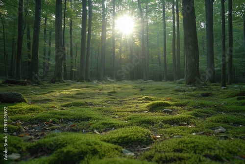 © Katerina, Obraz premium Sunlight filters through trees in a serene forest showcasing vibrant green moss underfoot