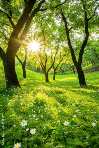 © Mykhailo Podolian, Obraz premium Sunlight filters through trees in a serene green meadow during a vibrant spring afternoon