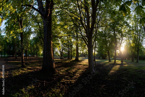 Fototapeta premium Sunlight filters through trees in a serene park setting.