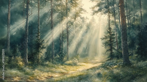 © OnuTH, Obraz premium Sunlight Filters Through Trees in Serene Forest Landscape Scene