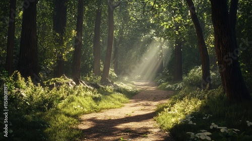 Obraz premium Sunlight Filters Through Trees in Serene Forest Pathway