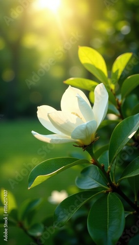 Fototapeta premium Sunlight filters through white magnolia blooms in a lush green garden,...