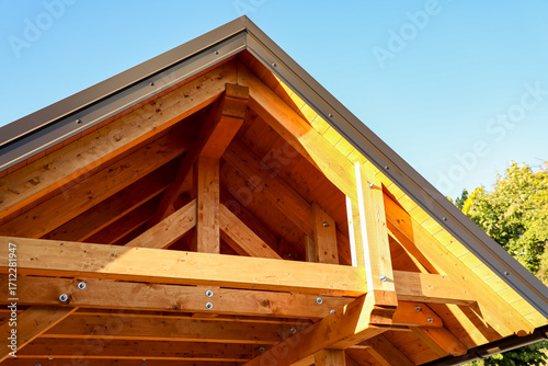 © Svitlana, Obraz premium Sunlight gently filters through a beautifully constructed wooden roof framework, revealing exposed beams and strong bolts that emphasize the rich grain of natural wood.