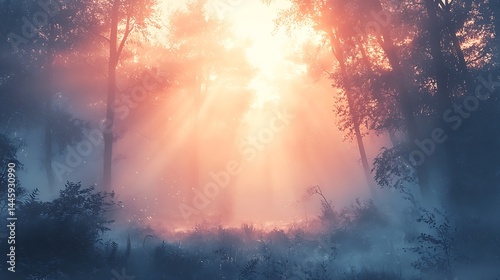 Fototapeta premium Sunlight glows through foggy pine forest high resolution picture