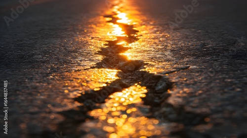 © rehan, Fototapeta premium Sunlight highlights a crack in a dark asphalt road.