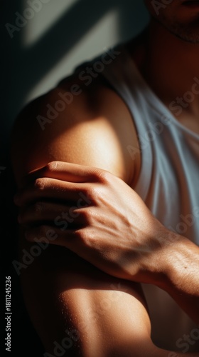 Naklejka premium Sunlight highlights a person's strong arm while they gently touch their shoulder