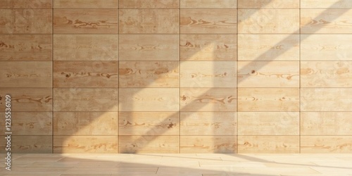 Obraz premium Sunlight Illuminates a Room with Light Brown Wood-like Tiles on the Walls and...