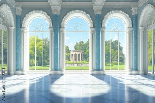 Naklejka premium Sunlight illuminates blue grand hall through large windows in palace or castle, surrounded by lush greenery