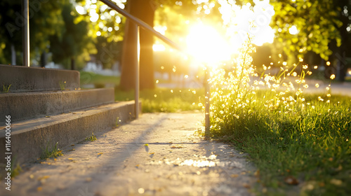 © Dibani, Obraz premium Sunlight illuminates dandelion seeds floating by concrete steps in a park.