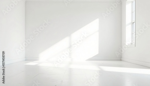 © Bakreen, Fototapeta premium Sunlight illuminates empty white room corner white walls floor window empty room