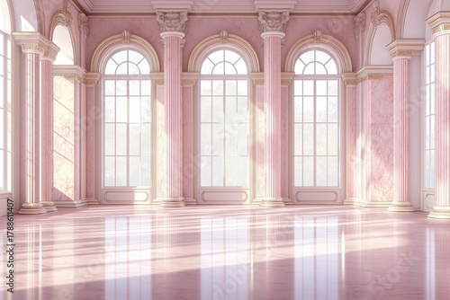Obraz premium Sunlight illuminates pink grand hall through large windows in palace or...