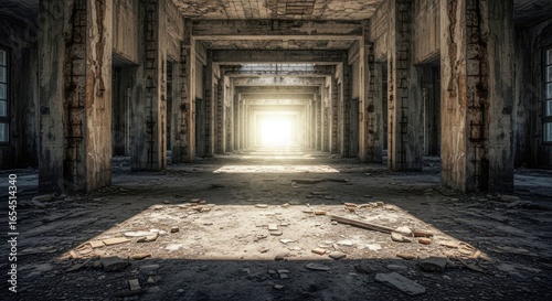 © Rana Graphic, Obraz premium Sunlight illuminates the end of a crumbling abandoned building hallway
