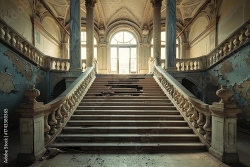 Obraz premium Sunlight illuminates through window and onto decaying grand staircase in...