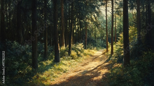 © Rere_Art151, Obraz premium Sunlight Illuminating a Path Through a Dense Forest