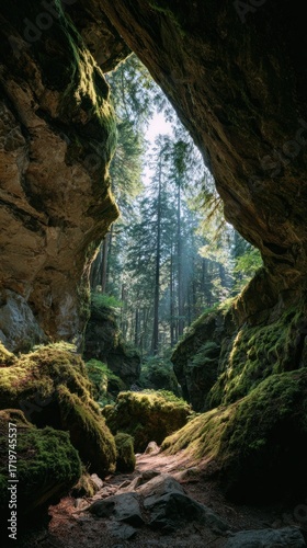 © mryanfahrudin1, Obraz premium Sunlight illuminating forest cave
