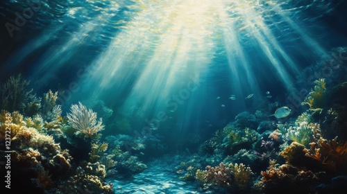 Fototapeta premium Sunlight illuminating vibrant coral reef underwater scene with diverse marine...