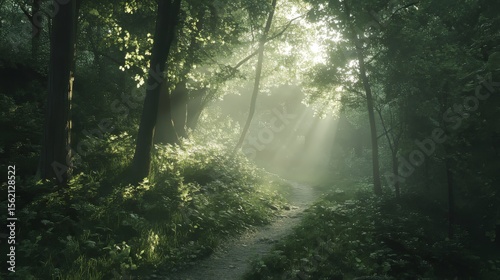 © Bilal, Obraz premium Sunlight in a European forest with a hiking trail