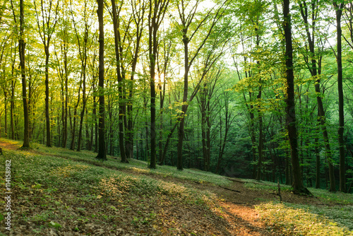 © amizadon, Naklejka premium Sunlight in the green forest.