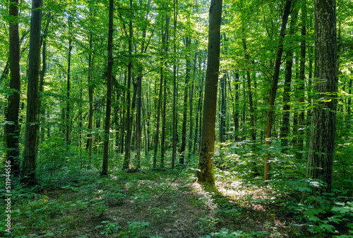 © nata777_7, Naklejka premium Sunlight in the green forest, spring time