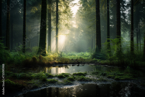Fototapeta premium Sunlight in the morning green misty European forest made with generative AI