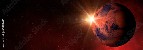 Fototapeta premium Sunlight over the planet Mars in the red starry outer space