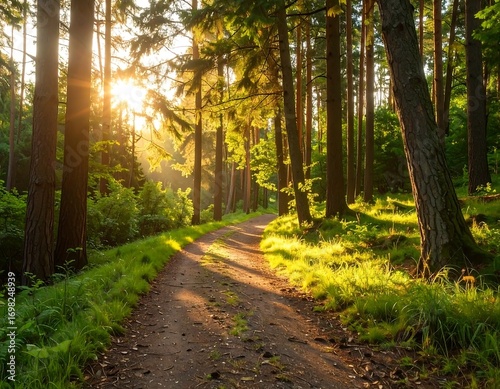 Obraz premium Sunlight path through a lush forest